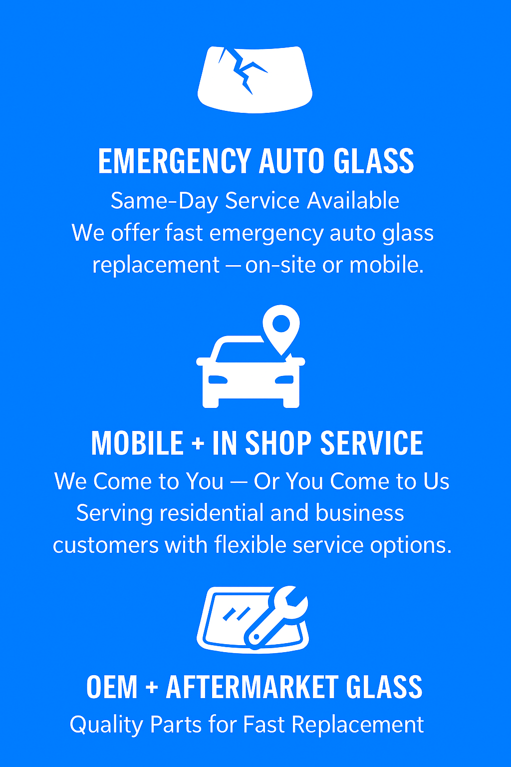 We offer same-day auto glass replacement and repair, both mobile and in-shop.
